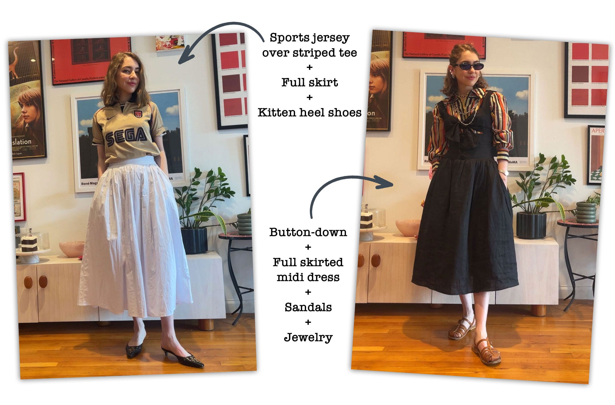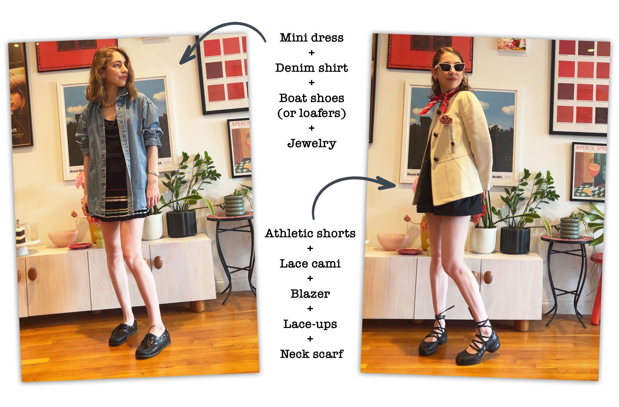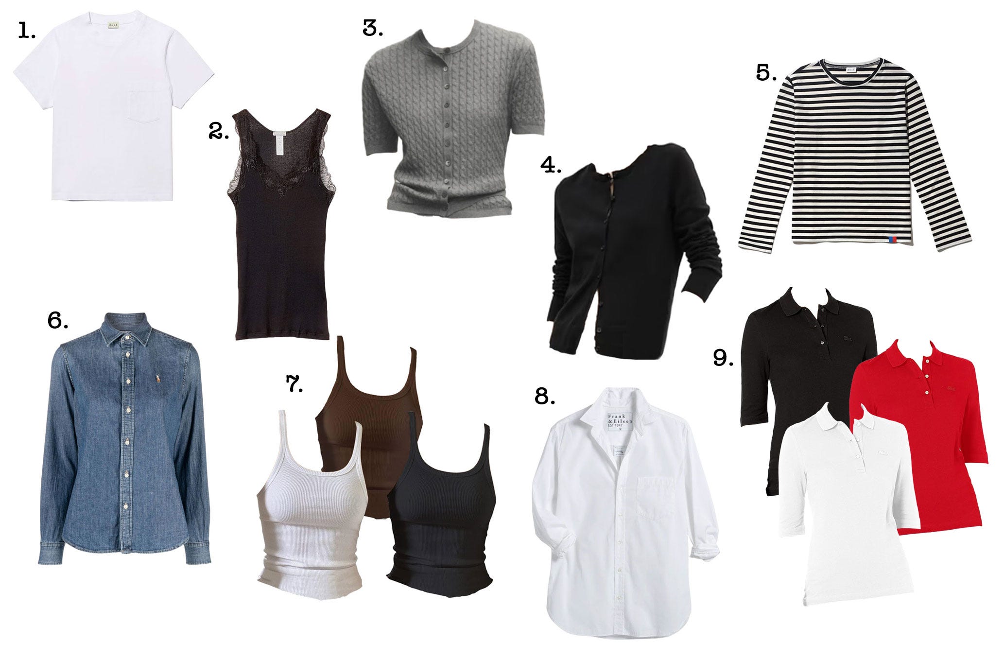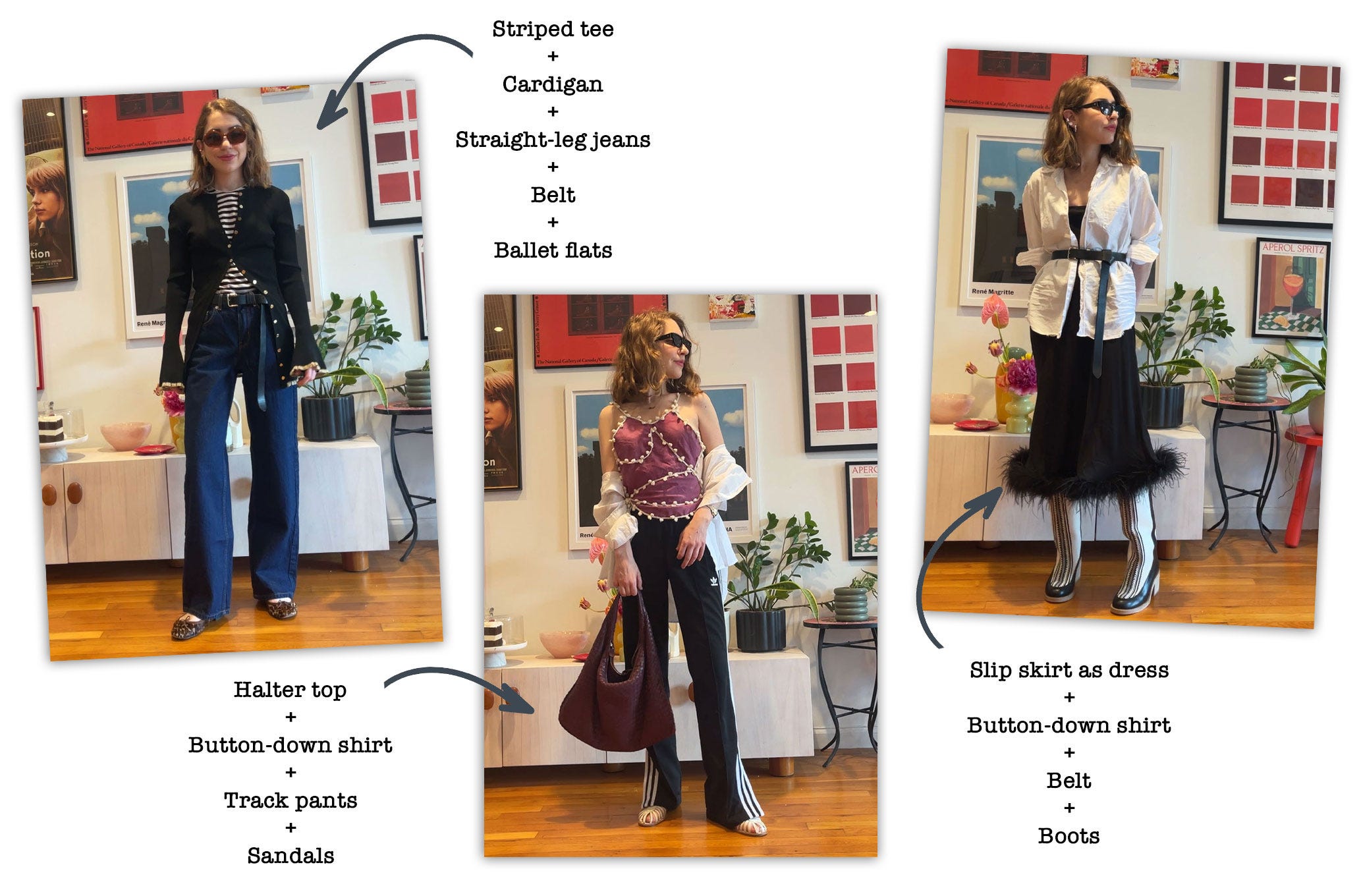 Whether it’s a tee and pants, a blouse and mini shorts, or a dress, the base is the first layer of clothing touching your body. This is usually how an outfit begins conceptually and always how it starts physically. It's important to be open to swapping these as you continue layering the other parts. Sometimes, the grey tee is better than the white one! Part 1 is, of course, important because it's the guts of your look.