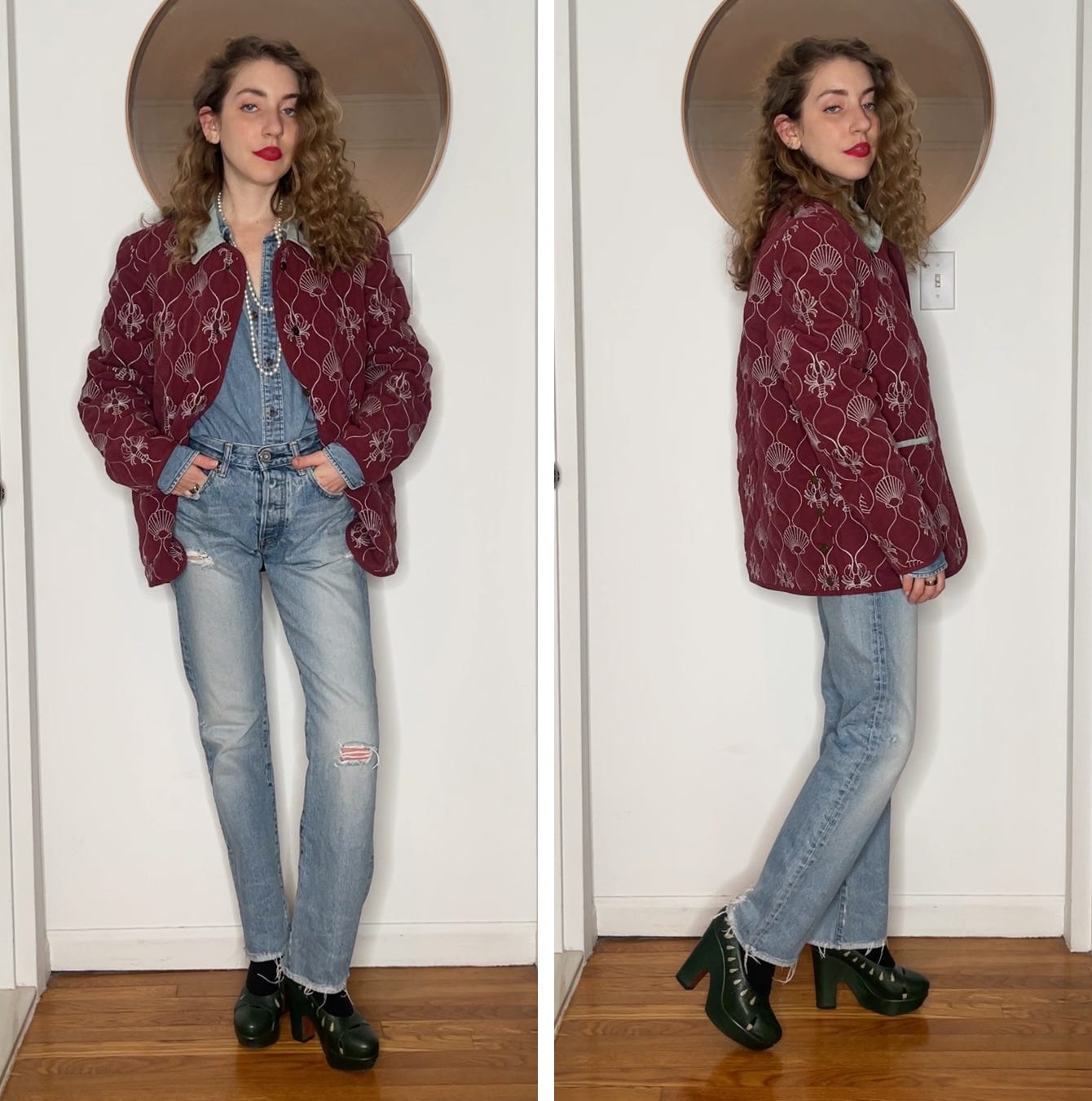My preppy is showing again here with this second jacket I’m loving: a quilted style from Tombolo. I adore it for the same reason I love the RL bomber. It’s the ideal layer that adds personality under your everyday overcoat. I got the size XS (their sizing is unisex). A lot of what they make is adorably kitschy (lobsters, spaghetti, some of my favorite motifs), but this quilted velvet jacket feels very timeless.